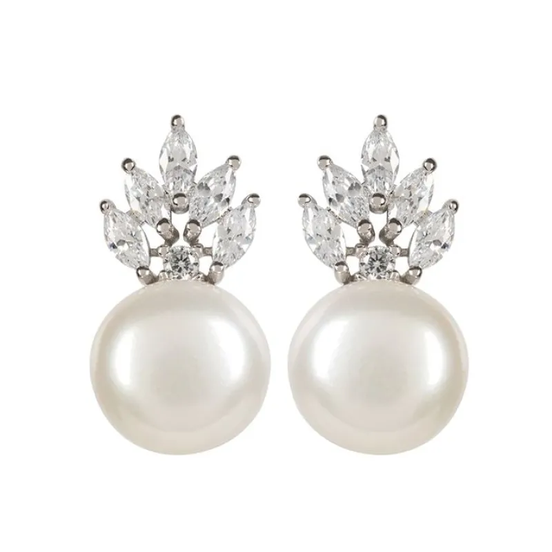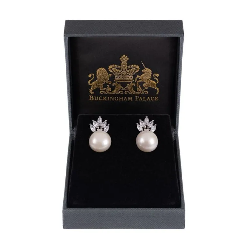 A Pair Of Striking Freshwater Pearl Earrings With A Magnificent, Surmounting Cubic Zirconium Crystal Crown Detail. Pearls Have Been Popular With Royalty For Centuries, Prized For Their Brilliance And Rarity They Were A Symbol Of Love, Purity And Beauty. Elizabeth I Was Often Painted Wearing Multiple Ropes Of Pearls And With Pearls Sewed Into Her Gowns. They Were Popular Too With Her Late Majesty Queen Elizabeth Ii And With Many Members Of The Royal Family.